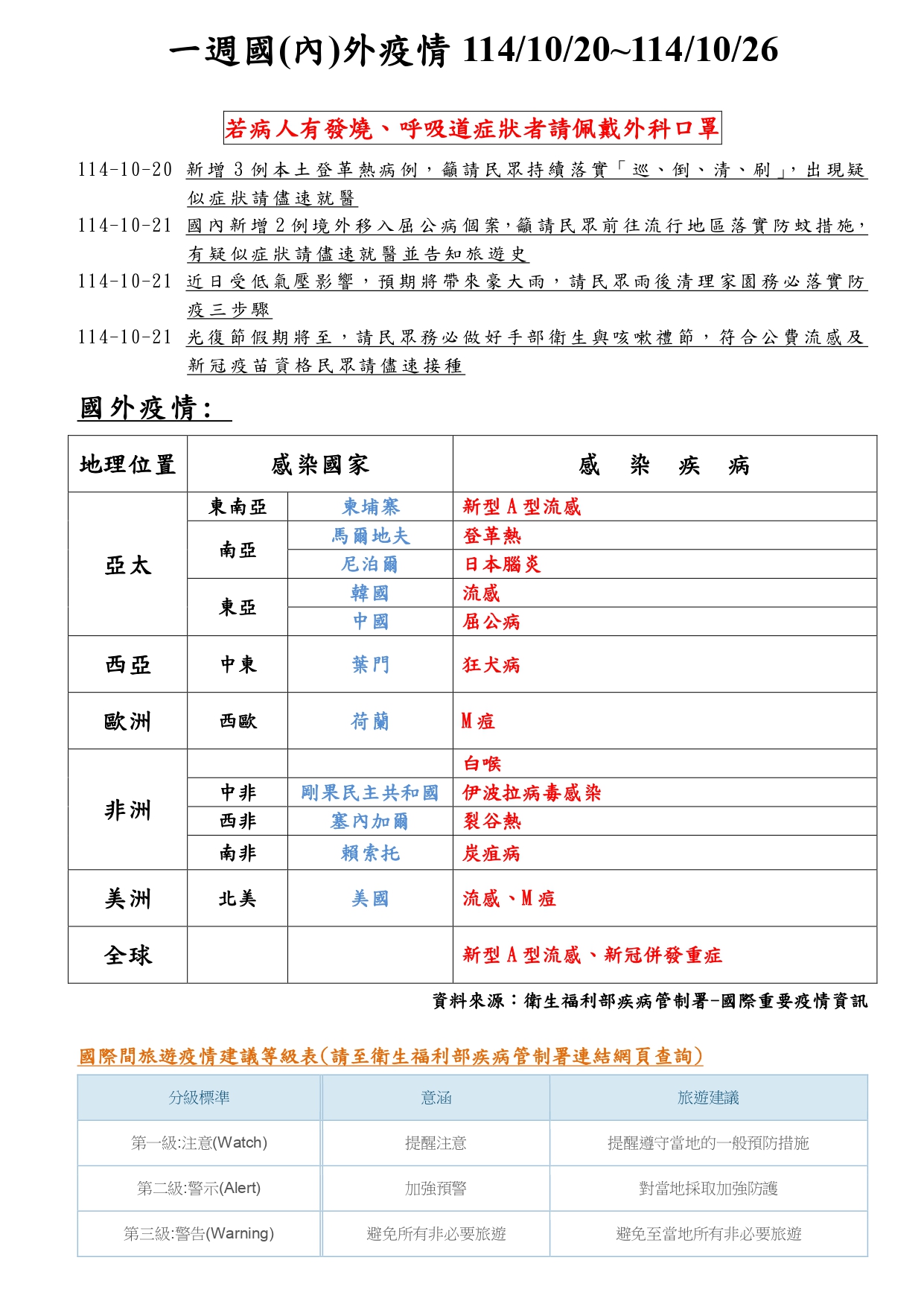 一週國(內)外疫情 114/10/20~114/10/26
