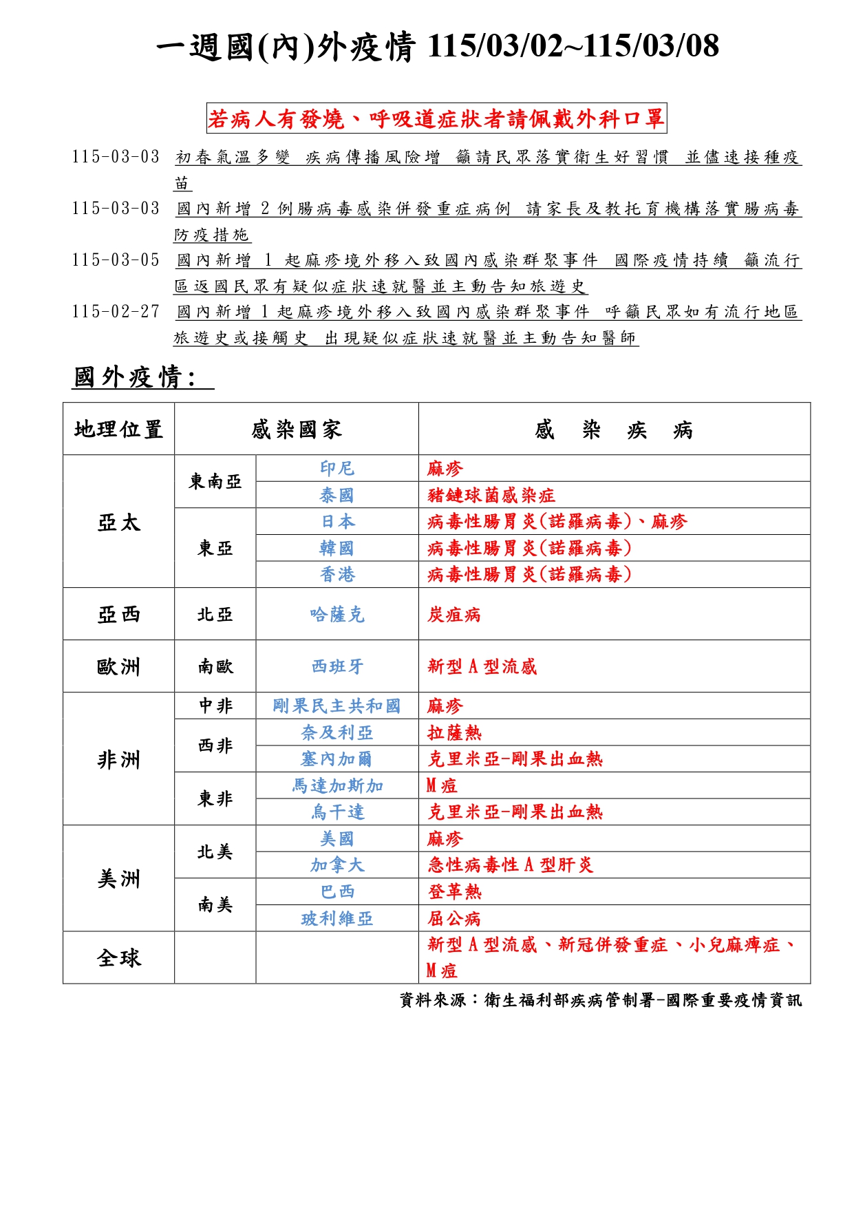 一週國(內)外疫情 1150302-1150308