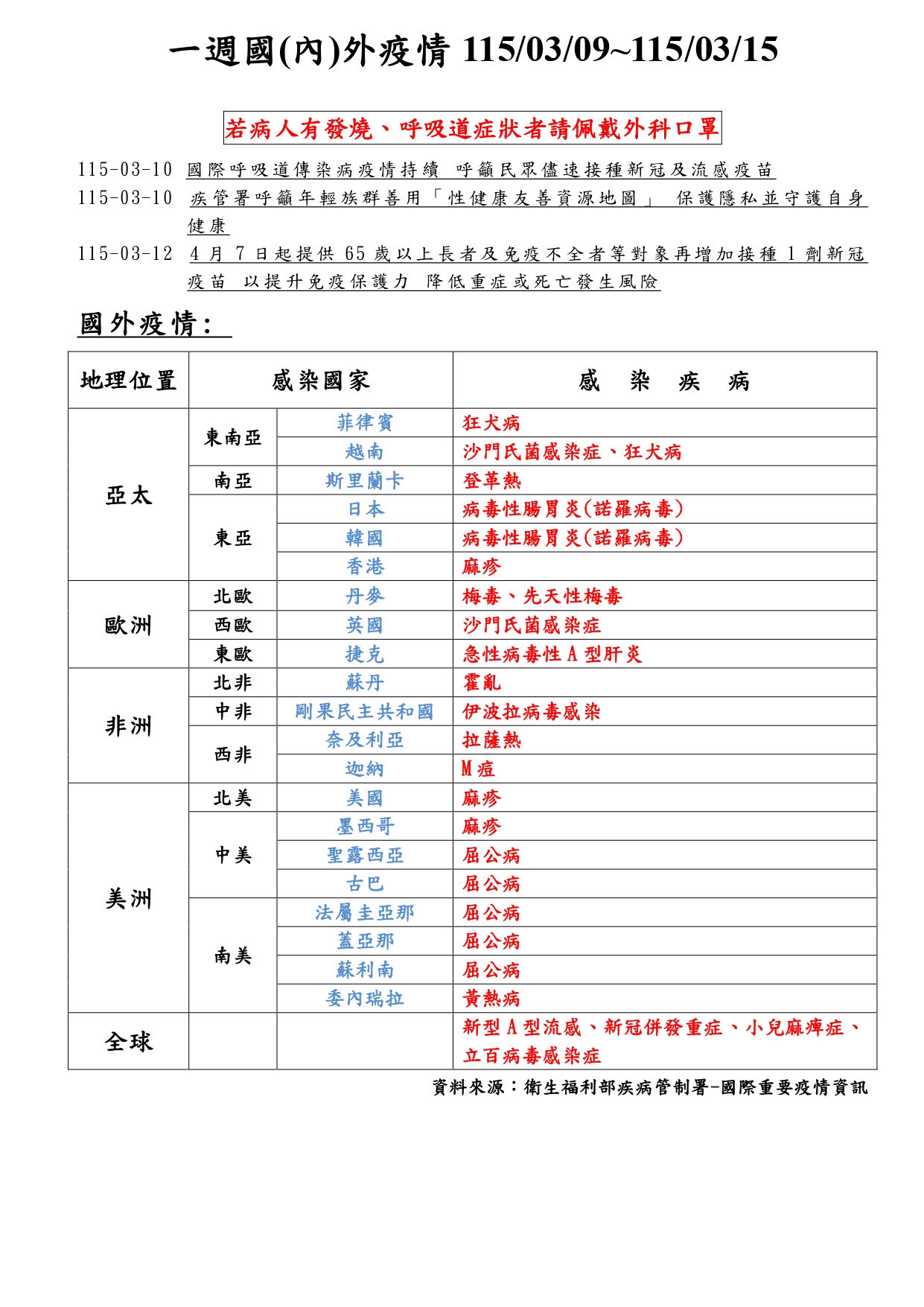 一週國(內)外疫情1150309-1150315
